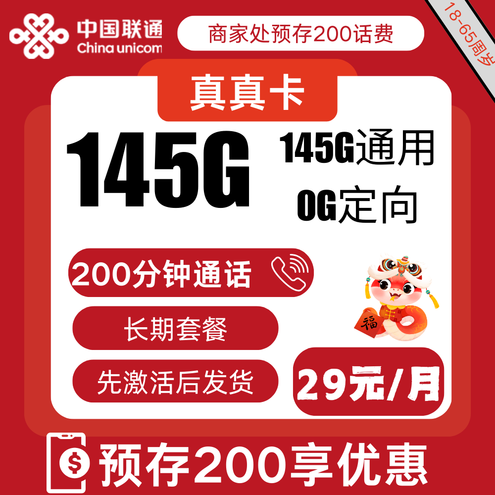 29元145G全国通用流量+200分钟通话